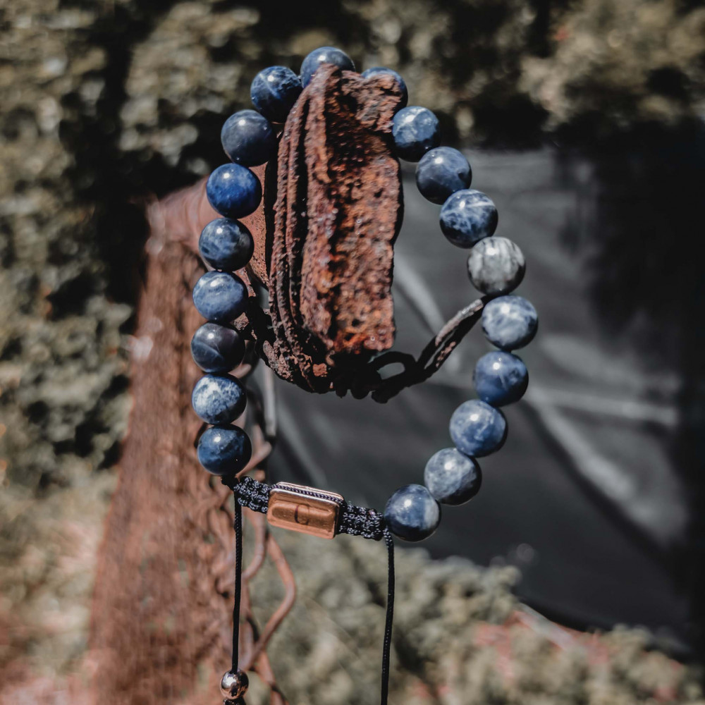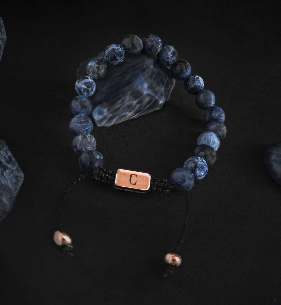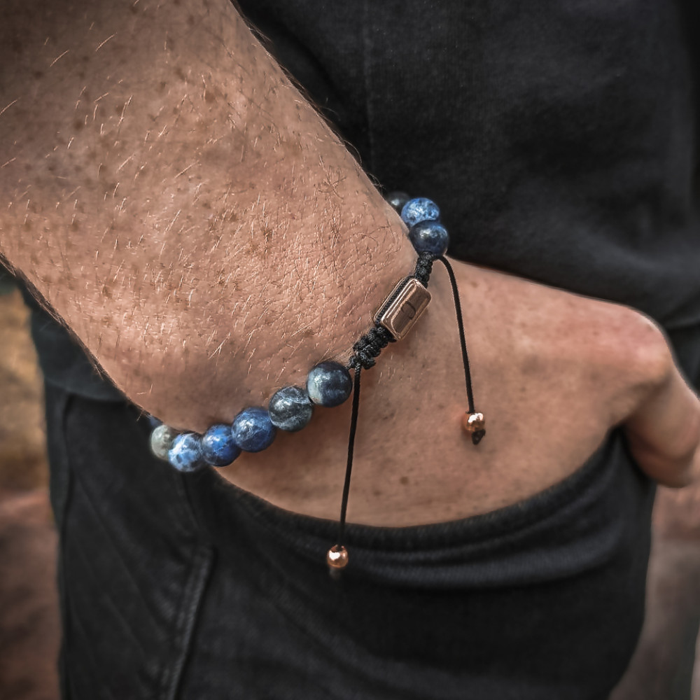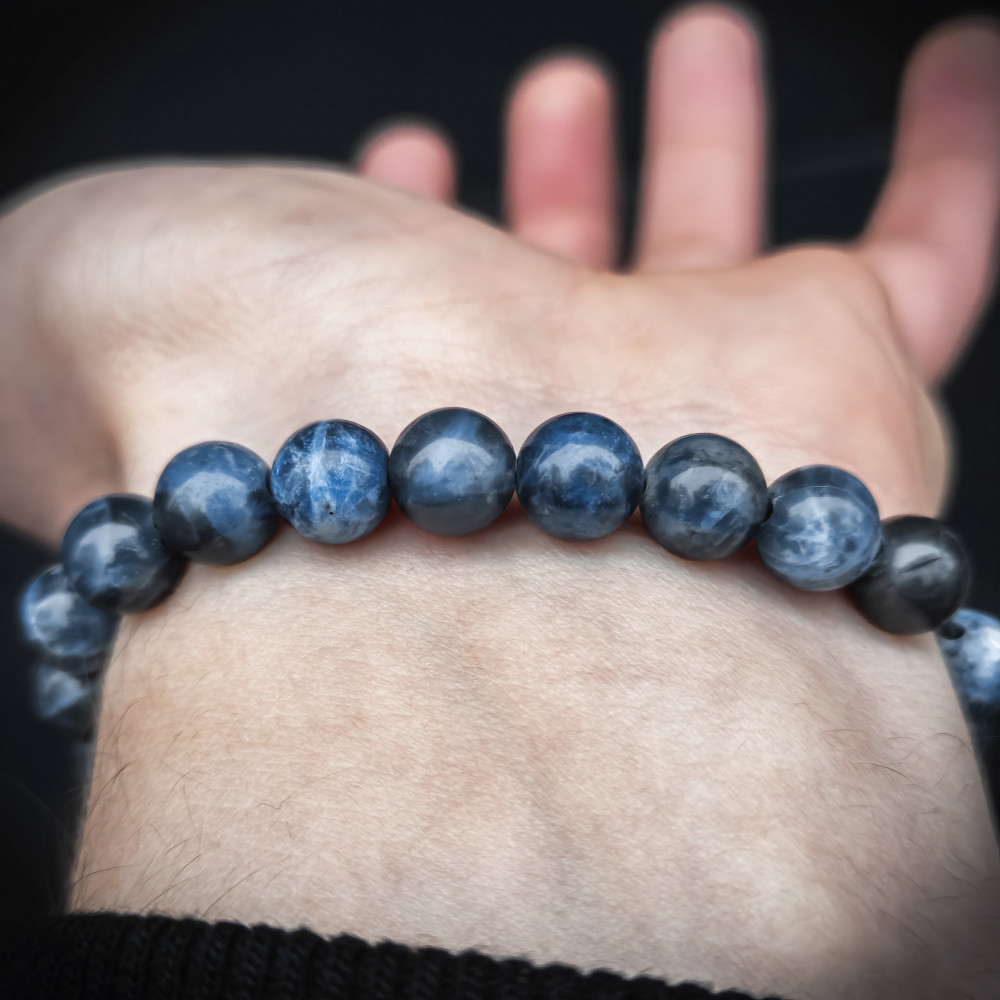 Tento pánský náramek je vyroben z modrého sodalitu, který je druhem křemičitého minerálu s unikátním modro-šedým odstínem, který svými vzory připomíná rozbouřené moře.