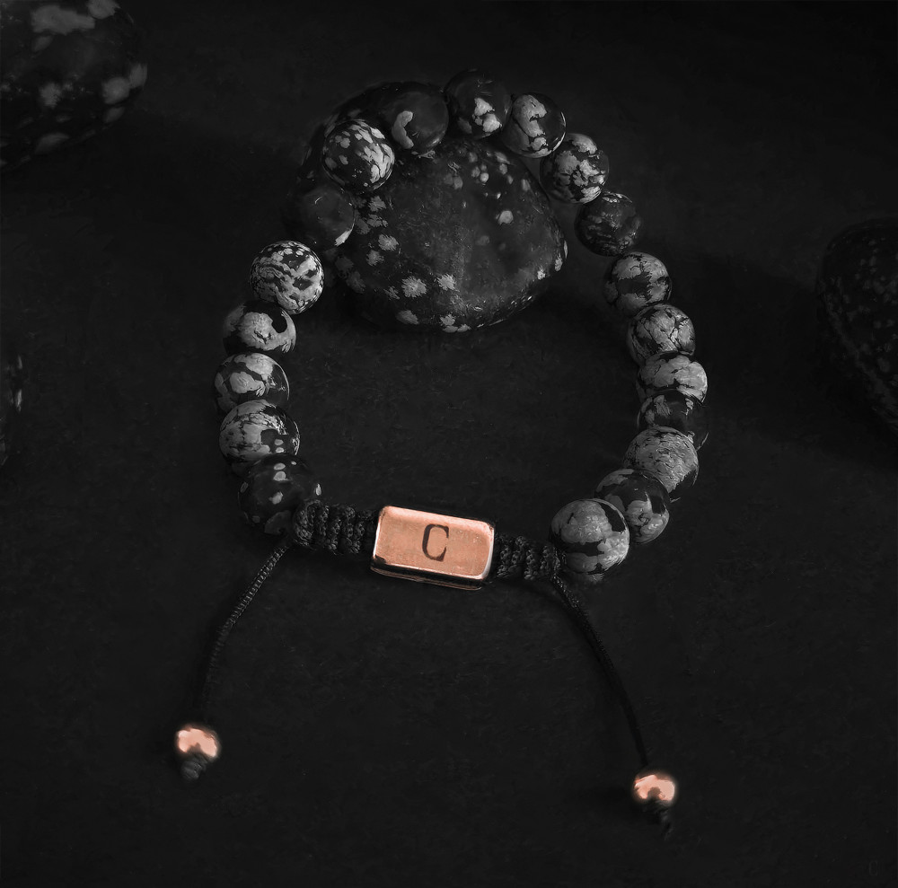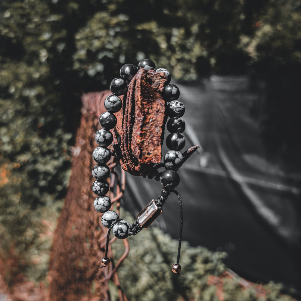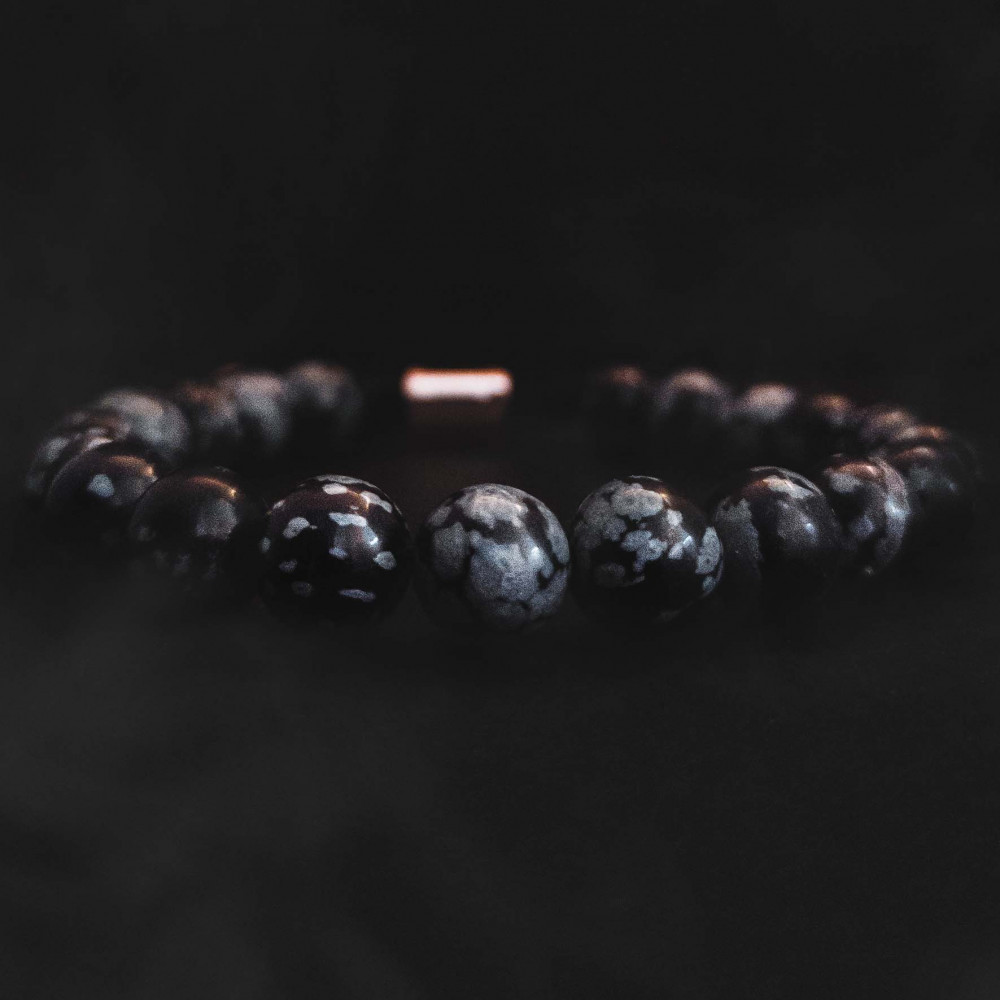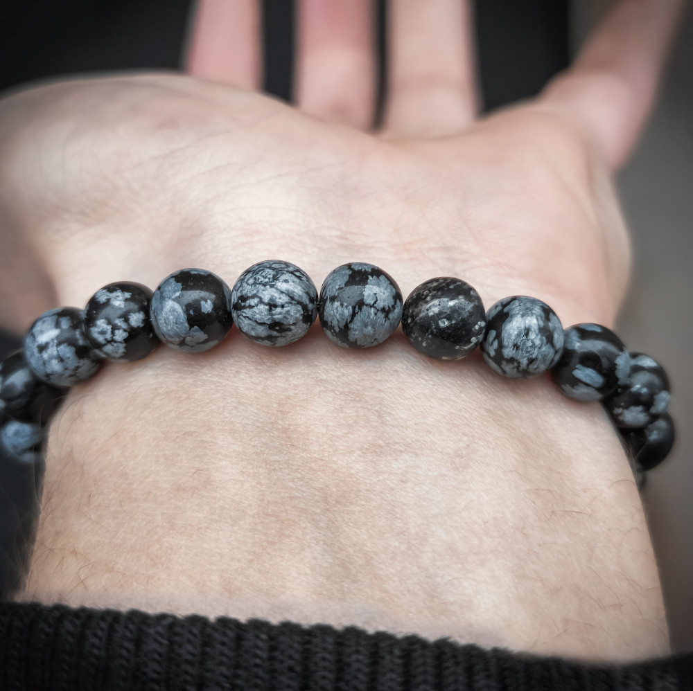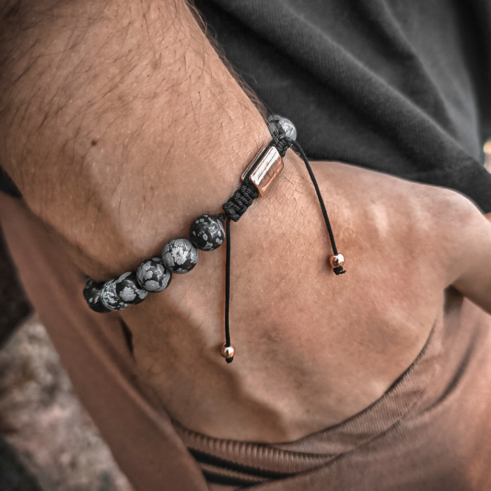 Vyzdvihněte svůj styl s naším pánským náramkem vyrobeným z korálků vločkového obsidiánu. Jeho jedinečná kombinace černých korálků a vločkové struktury přináší do vašeho outfitu záhadný a sofistikovaný nádech, který zanechává nezapomenutelný dojem. Díky flexibilnímu nastavení velikosti si tento náramek snadno přizpůsobíte svému zápěstí, což z něj činí ideálního společníka pro každodenní nošení.